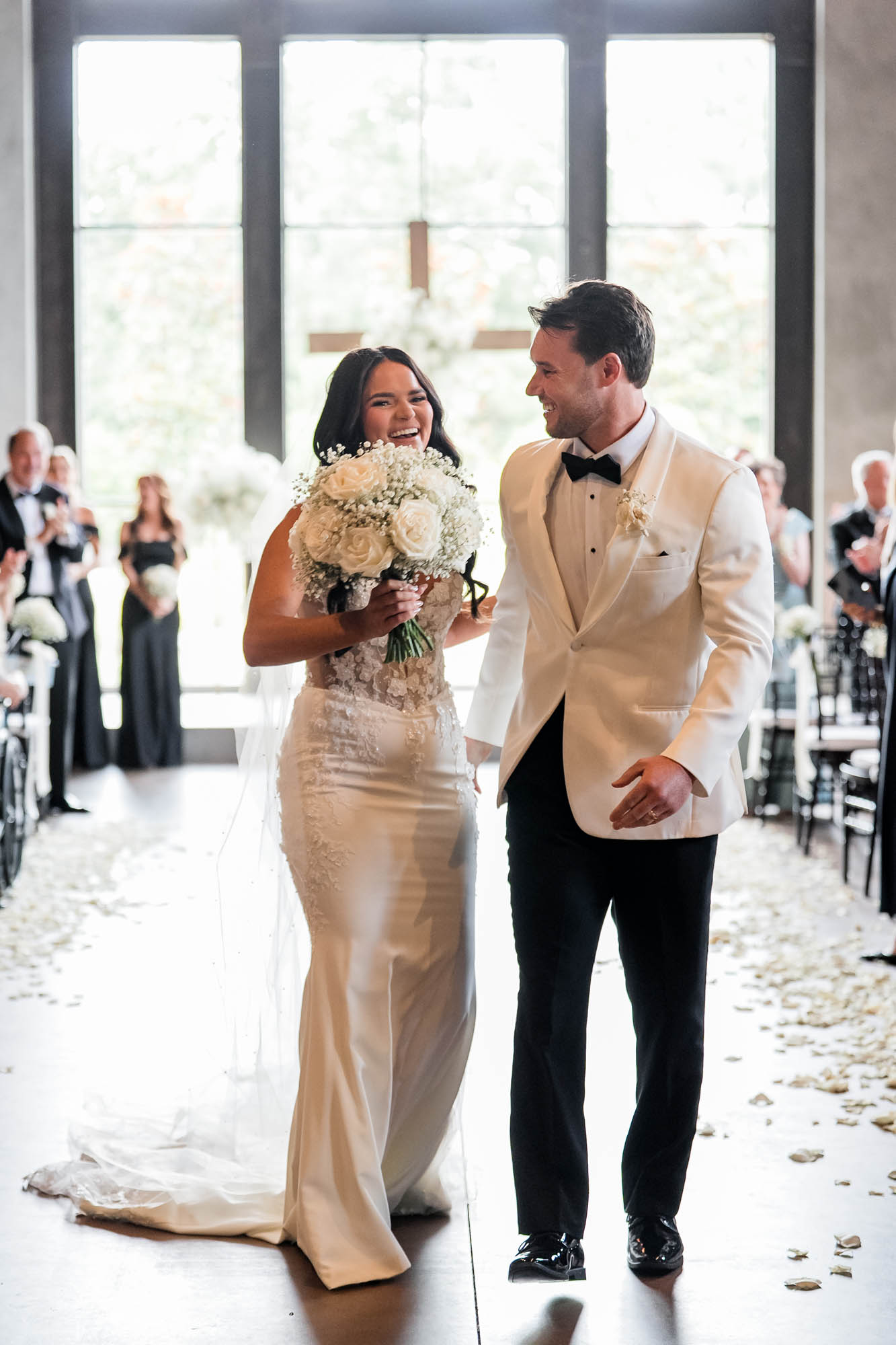 It’s no secret that the black-and-white combination has an enduring quality — and that’s largely because of its versatility. Based on how you style it, the palette can be both modern and timeless, simple and sophisticated, minimalist and full of personality. At this couple’s reception at The Olana, for example, a mostly black-and-white palette informed the tablescapes. Crisp-white, pared-back place cards and black envelopes offered a modern interpretation of an effortlessly minimalist setup by Lyons Paperie. White taper candles and clusters of baby’s breath further brightened up this light-filled celebration.