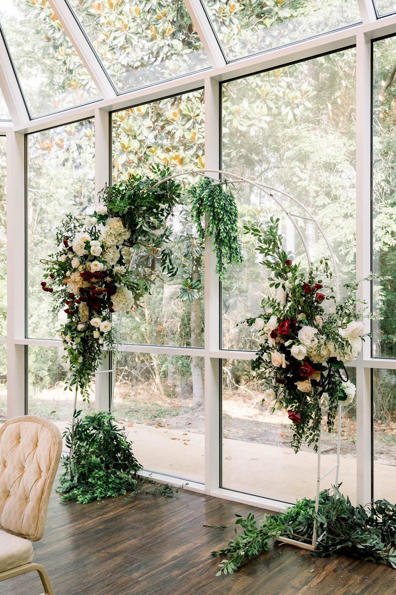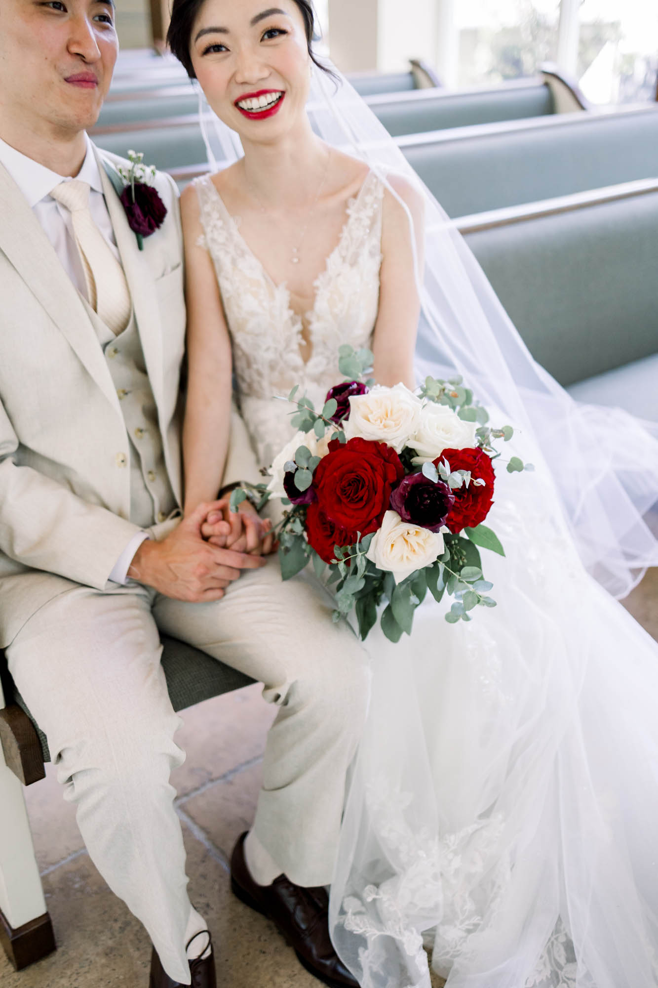 Burgundy, wine, oxblood, bordeaux — whatever you want to call it, this deep reddish-brown shade has had a hold on everyone since last fall, and the color trend is showing no signs of slowing down. If you’re looking to lean into this rich, wine red for your big day, take a page out of this couple’s wedding at Chapel at Palacios. The reception made a compelling case for burgundy with dark and moody floral arrangements that added an extra dose of romantic sophistication to the celebration. Alternatively, if you’re more interested in subtle pops of color, quietly weave burgundy into simple aisle florals, like this ceremony setup at The Milestone, Georgetown.