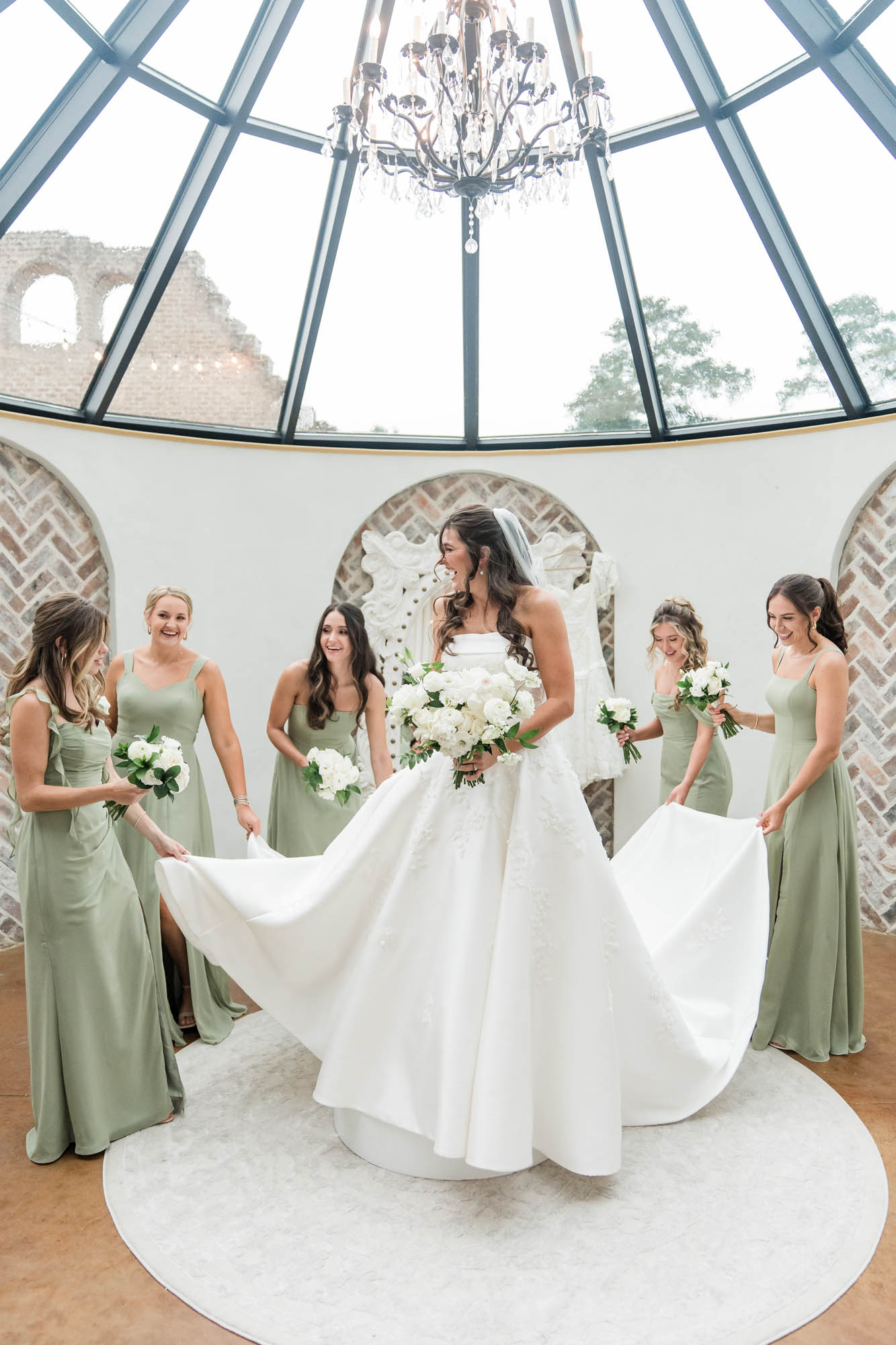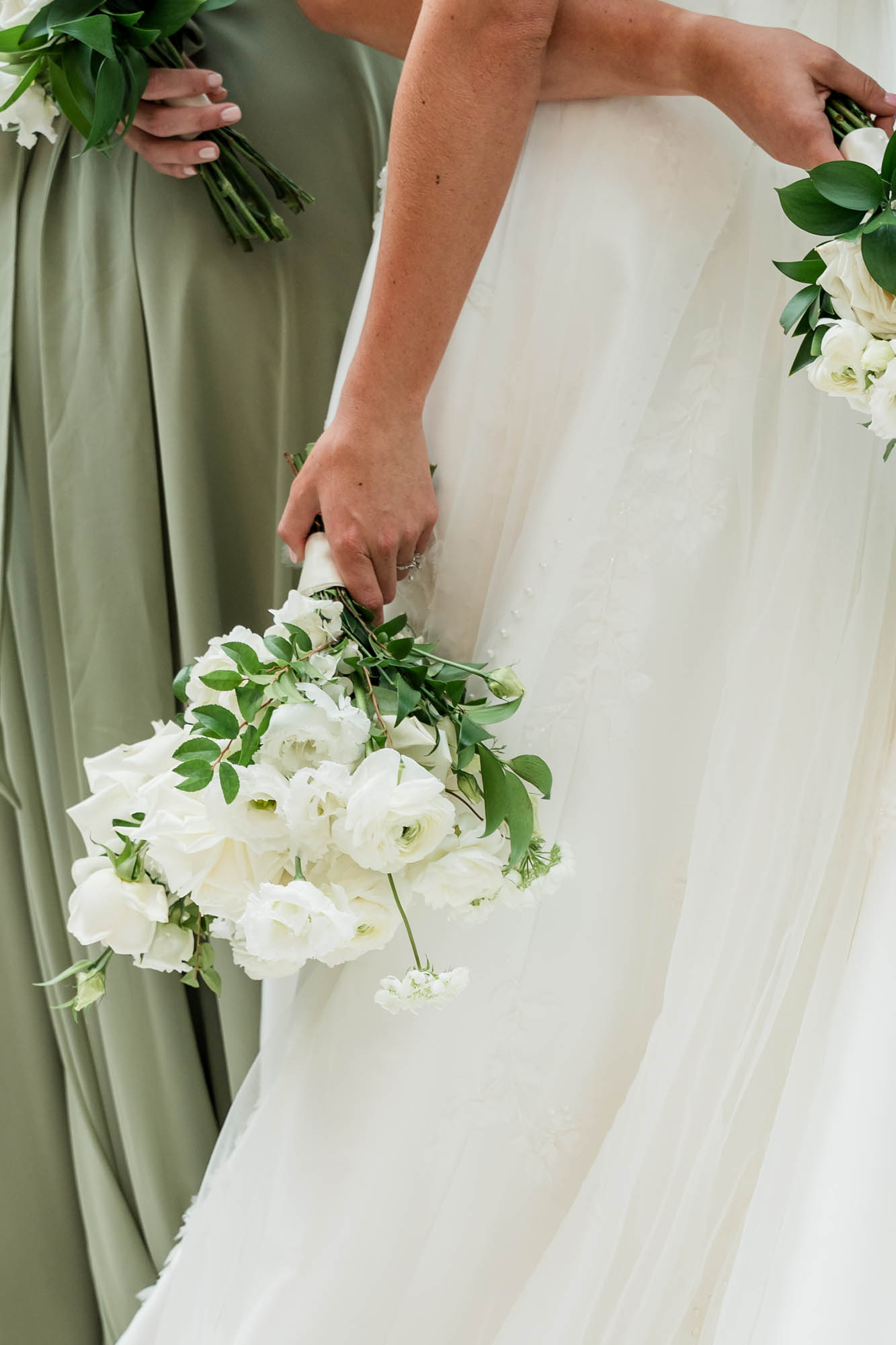 You can’t go wrong with this color combination, which is why it’s a perennial favorite that works beautifully year-around. It’s neutral enough to appeal to most tastes — yet rich enough to stand out. The easiest way to adopt this palette is by focusing on natural foliage and organic textures. Think: simple clusters of eucalyptus, olive branches, or ferns, mixed in with ivory-colored roses. This couple’s wedding at the Iron Manor, The Milestone Montgomery, achieved exactly that with a whimsical bouquet and aisle florals. Pops of gold are always an elegant addition, just like this reception’s tablescape at the Wildwood Inn. Another way to utilize the palette is through your bridesmaid’s attire, just like these sage-green dresses, worn in different styles and fabrics. As for your wedding cake, subtle green brushstrokes can add a refined touch to a simple white cake — take a look at this creation by The Jenny Layne Bakery.